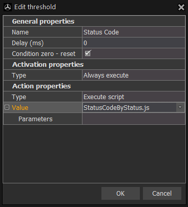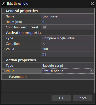 Let's assume, that we have channel Active Status Code which returns active status code from the controller. Now, we need to configure the threshold and assign it to the channel Active Status Code in the following way: