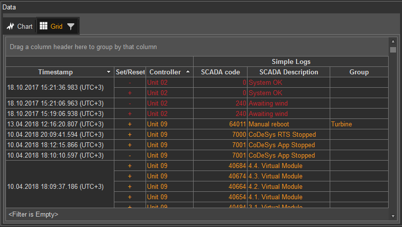Generally speaking, logs display graphical or numerical presentation of the selected parameters over a definite time period, which a user has prior specified. The logs data can be presented in two modes - Chart and Grid. You can easily switch between the data presentation modes by clicking the corresponding icons.